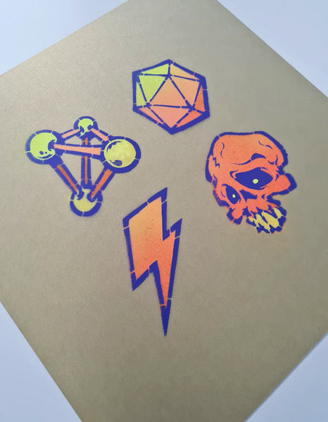 Cornerstones E is a 11.5" x 12" stencil print on 270gsm Pearlescent Gold Cansen stock. 1/1 - signed.