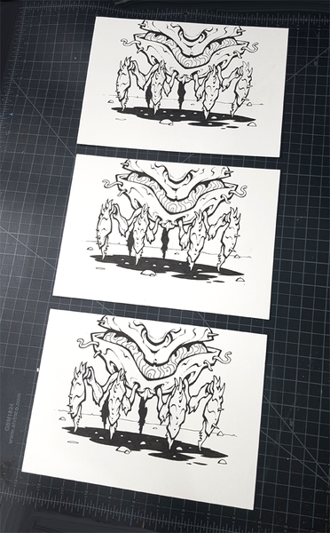 Exquisite Corpse BOTTOM #007 is a 6.7" x 9.4" hand-rendered ink on 300gsm Hannemuhle Britannia stock. LE3. Bottom segment. Signed & numbered, comes with stencilled COA.